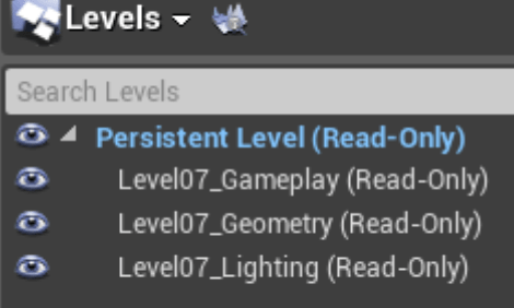No open world functionalities are included. This means you will have one file per level. You can use the Level Streaming feature, which is really helpful when working on a non-open-world game but still want to keep files separated for your teammates. You can have separate levels for audio, gameplay, geometry, lighting—whatever you need.