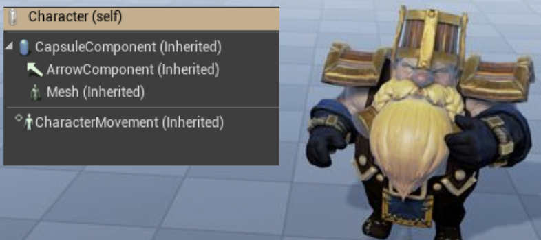 Character extends from Pawn and is a large, advanced class. It implements replicated character movement functionality via the CharacterMovementComponent. Its root component must be a CapsuleComponent, which is used by the movement system. It also includes a SkeletalMeshComponent for graphical representation.