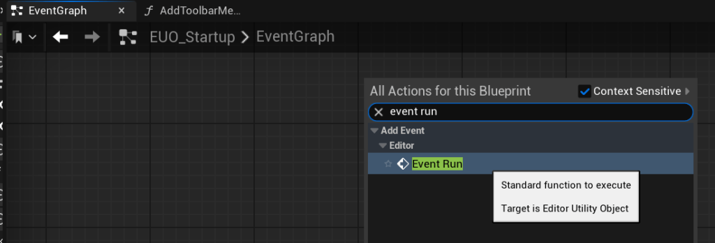 Now you need to tell the engine to run EUO_Startup at startup. The EUO_Startup Blueprint itself will then react by adding the toolbar buttons.
