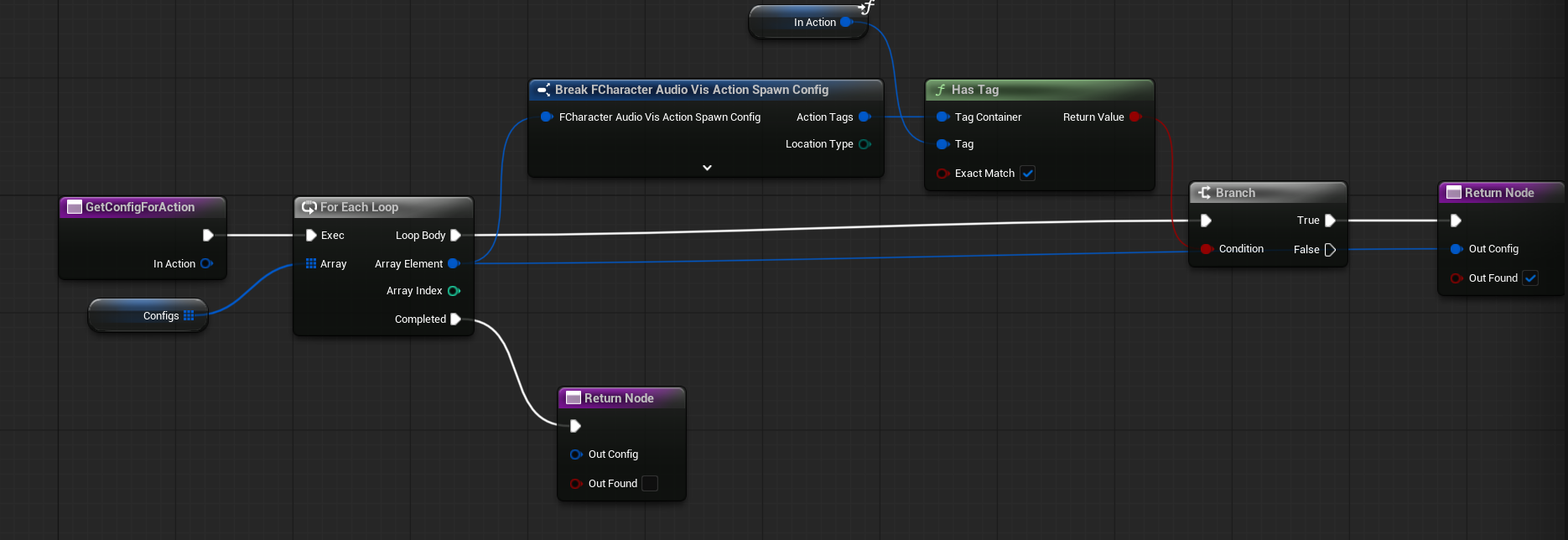 GetConfigForAction. Returns the corresponding audio-visual config for a given action tag. This is used by the runtime system to determine what to spawn and where.