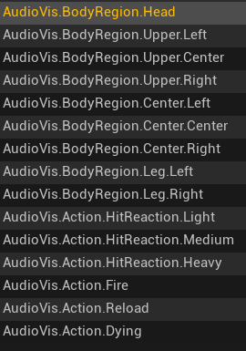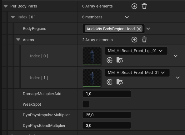 Tags that identify different parts of the character’s body (e.g.,AudioVisual.BodyRegion.Head), useful for hit reactions and weak spot logic. - Hit reactions intensity