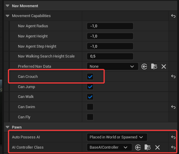 Also, take a look at the class defaults—they enable crouch mechanics and spawn the default AI controller.