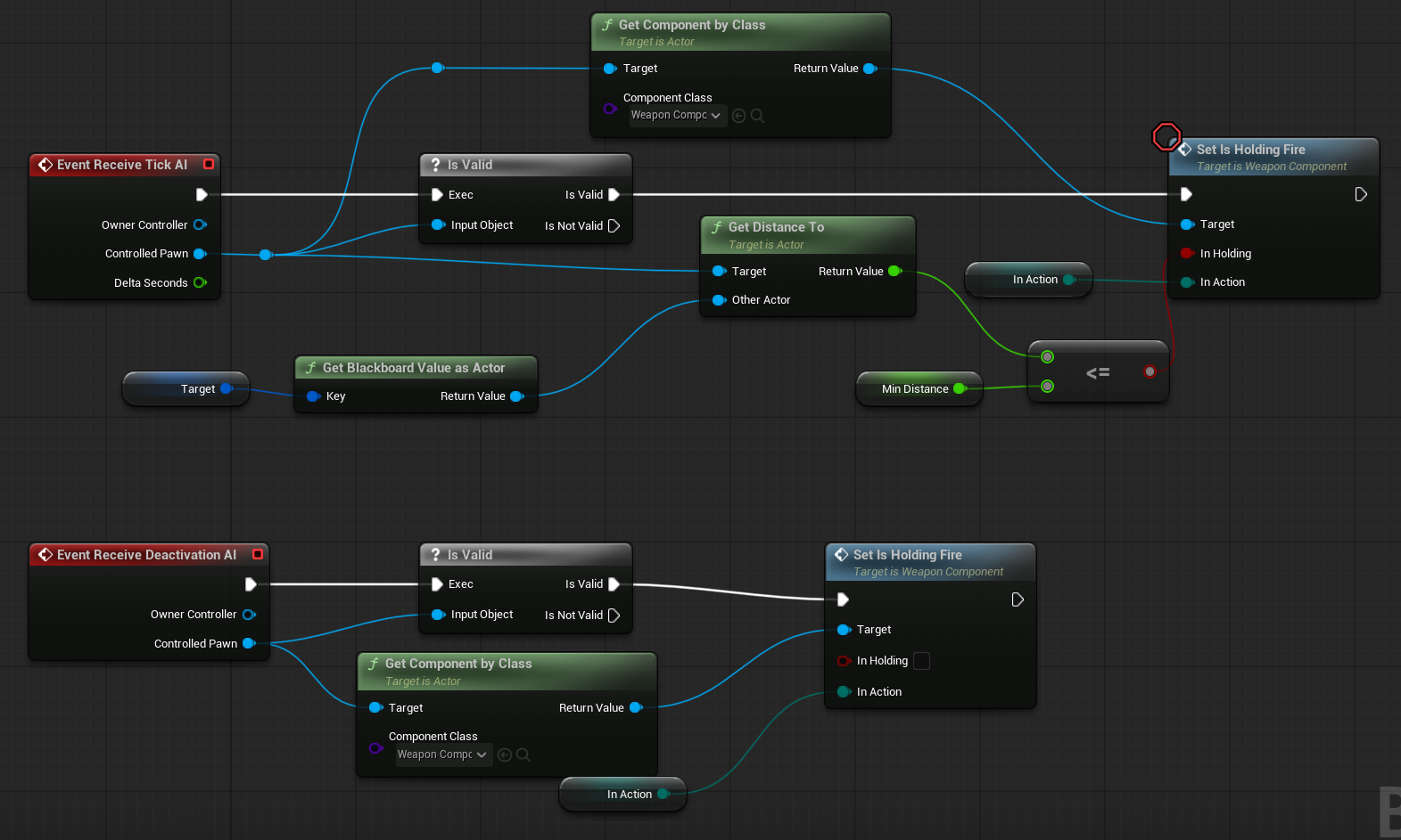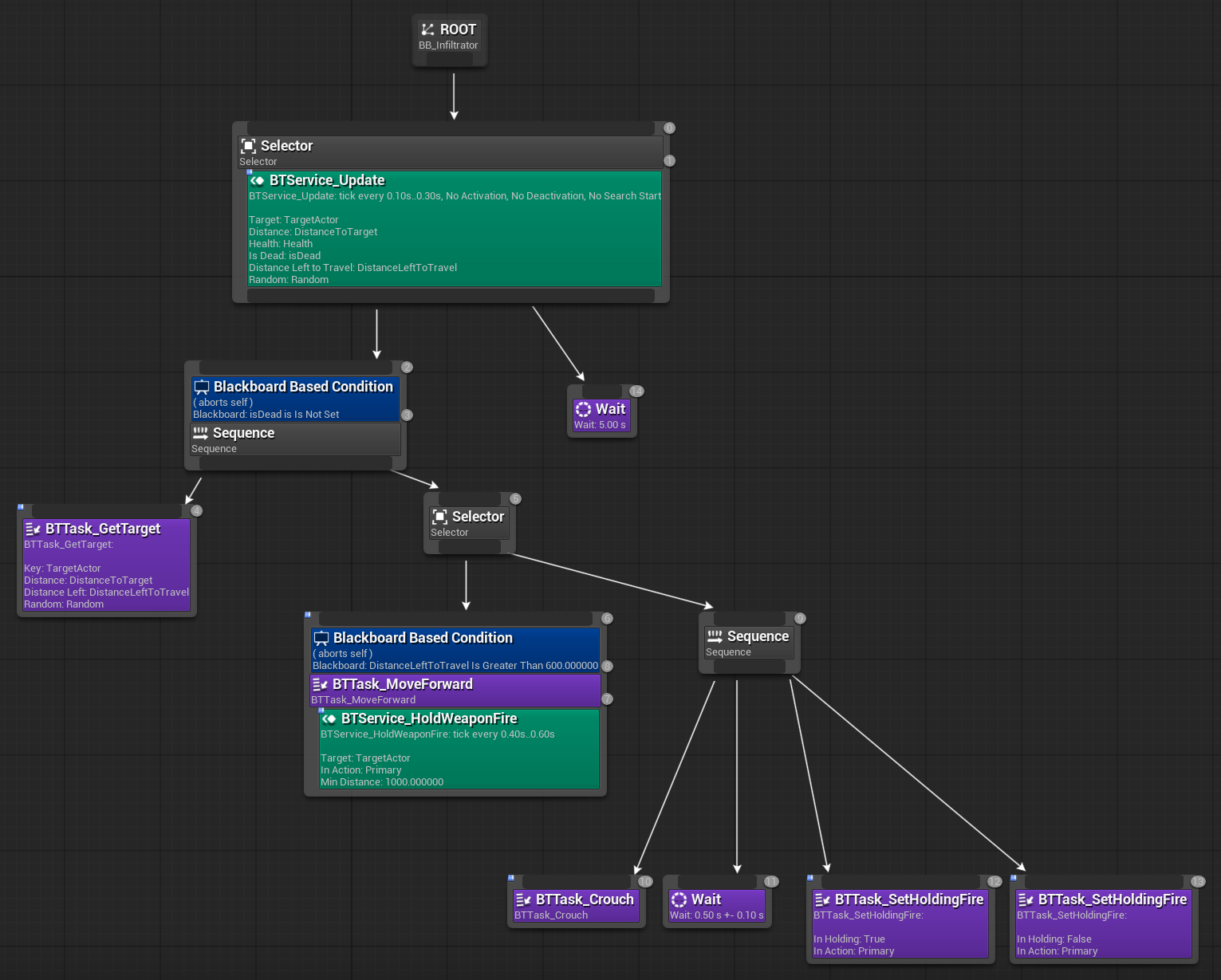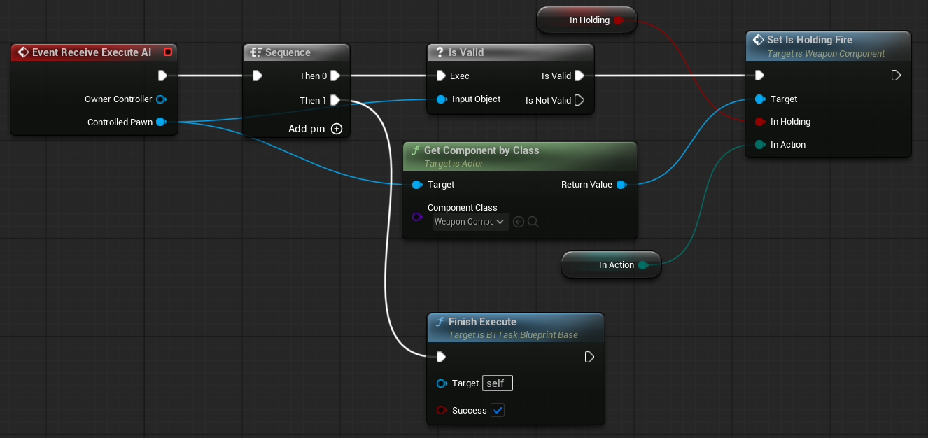 BTTask_SetHoldingFire. This task allows us to enable or disable the weapon trigger within the Behavior Tree.