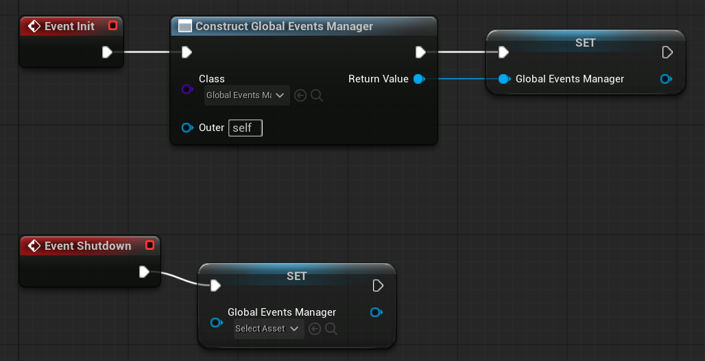 If we were using C++, this would typically be a Game Instance Subsystem, since we want the events to persist across levels.