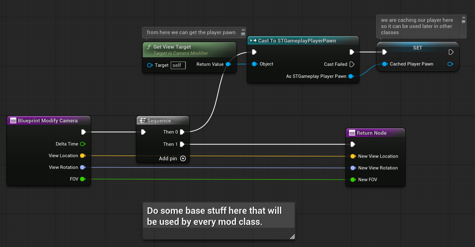 Now that we have the base class, let’s create a modifier to change our FOV. Create a new Blueprint named STCamMod_Aim, extending from STCamModBase. Override the Blueprint Modify Camera function: