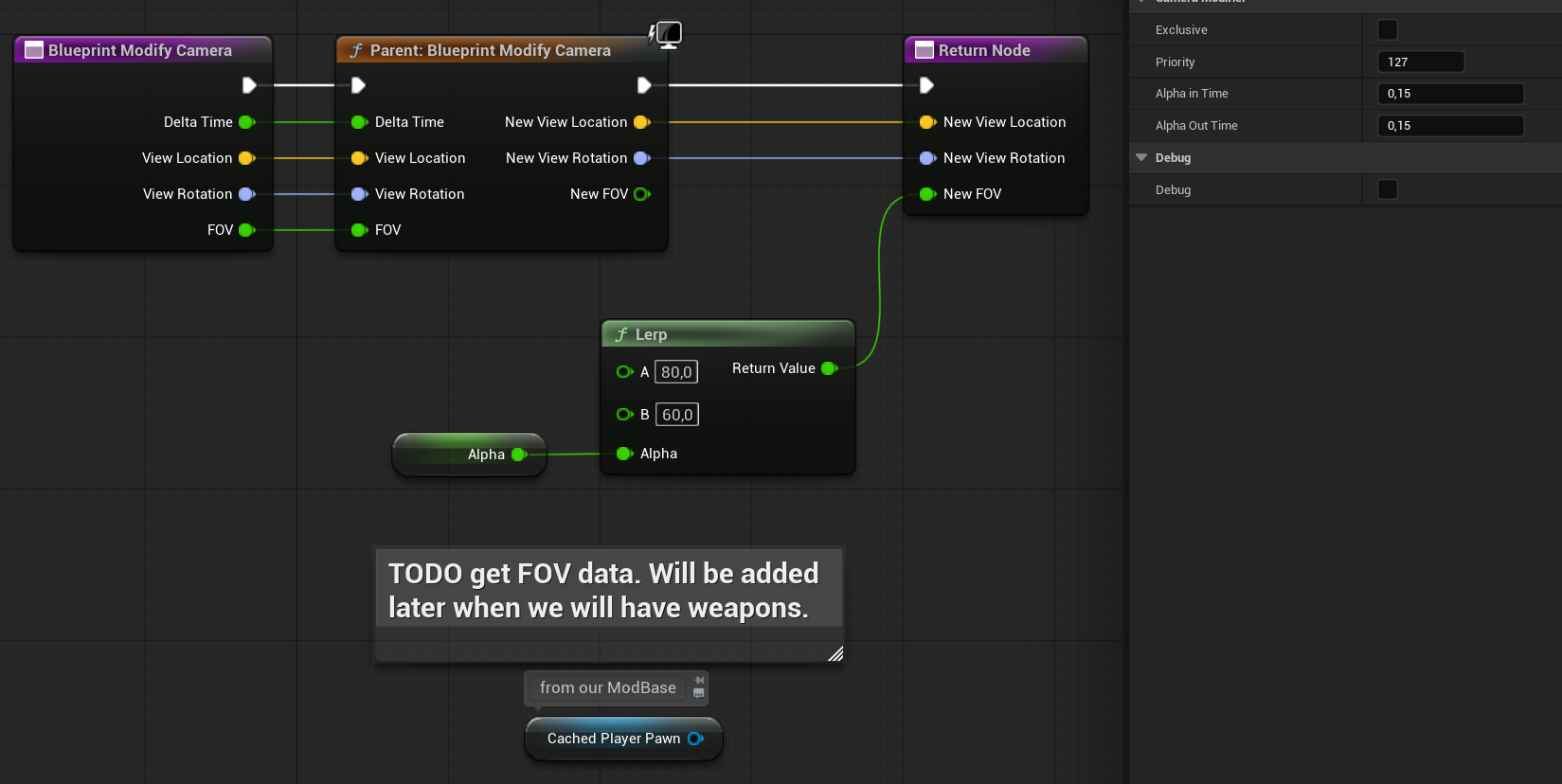 - We use an Alpha value to drive the FOV. In the Details panel, you’ll see Alpha In/Out times, which control the interpolation when enabling or disabling this modifier.