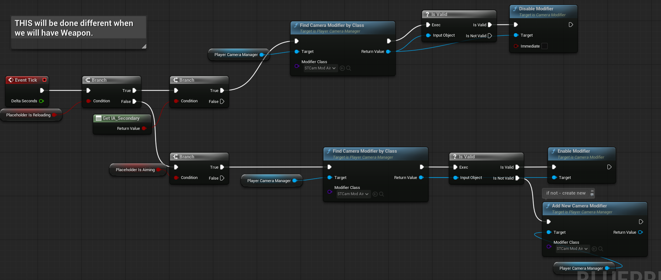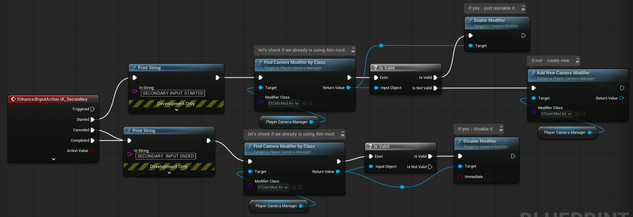 This is the proper way to manage camera modifiers. First, check if the modifier is already running — if it’s not, create it; if it is, just re-enable it. This prevents spawning a new modifier each time you press the secondary input.