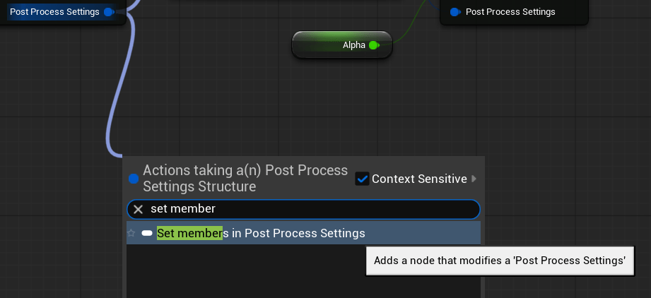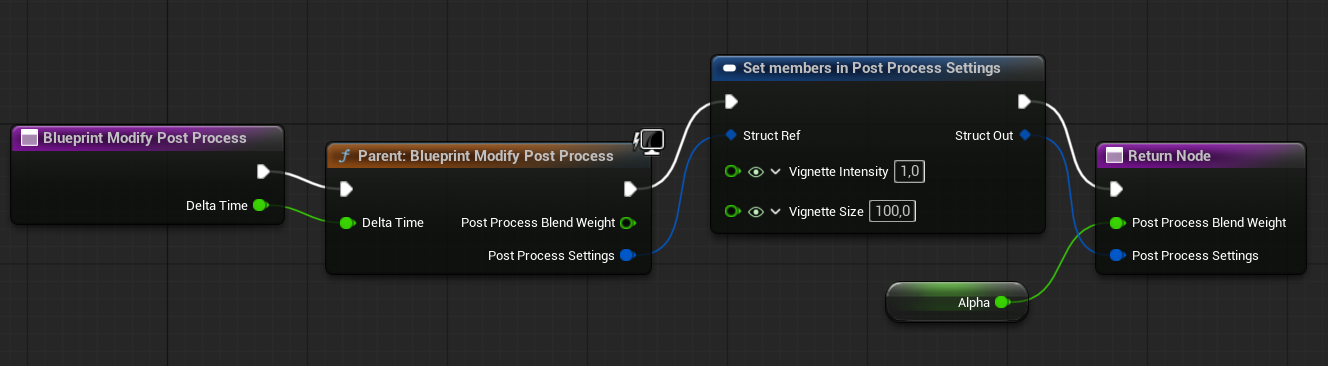 We are also using Alpha here to drive the blend weight. This means you will see the vignette post-process effect smoothly interpolate when the Aim modifier is active.