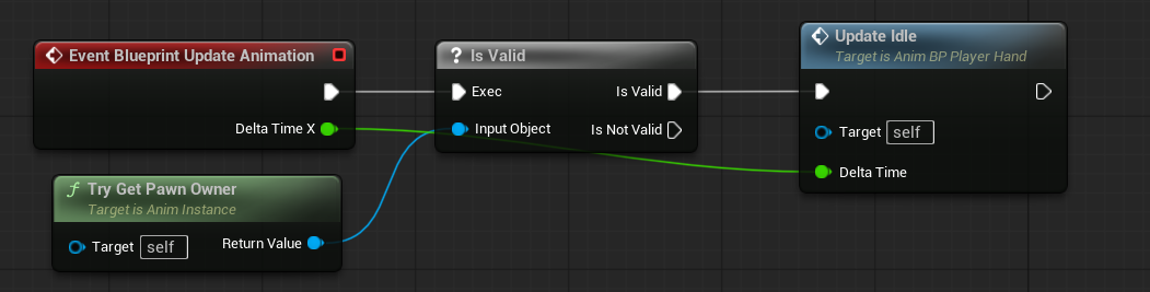 Next, go to the Event Graph and call the UpdateIdle function every frame using the Blueprint Update Animation event.