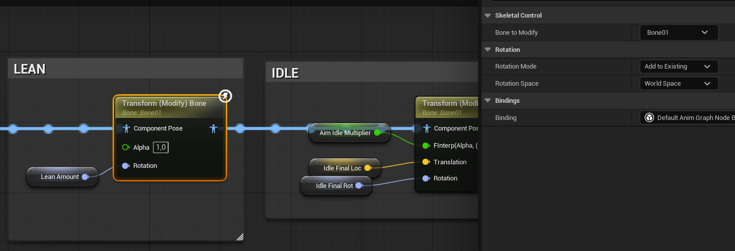 Finally, in the Anim Graph, add another Transform Bone node to apply the lean effect.