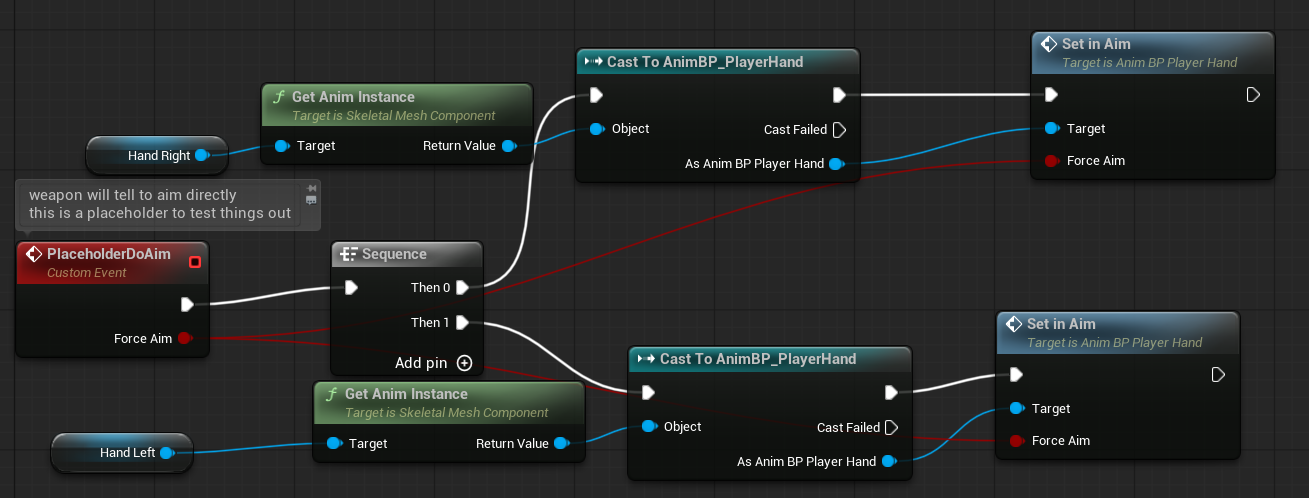 Just like with Aim, since we don’t have weapon functionality yet, we’ll pass placeholder data from the Player Controller → Pawn → Anim Blueprint.