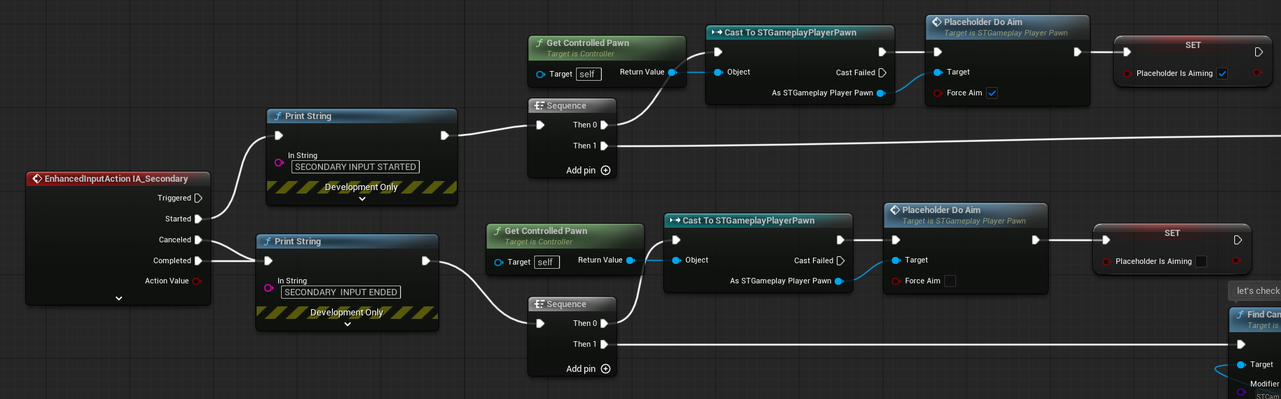 Next, use the IA_Secondary input action event and call the PlaceholderDoAim function on the Pawn to toggle aiming.