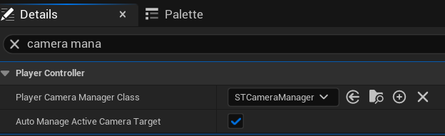 STGameplayPlayerControllerBlueprint. - In the Class Defaults panel (select the root node in the Blueprint editor), locate the Player Camera Manager Class property.