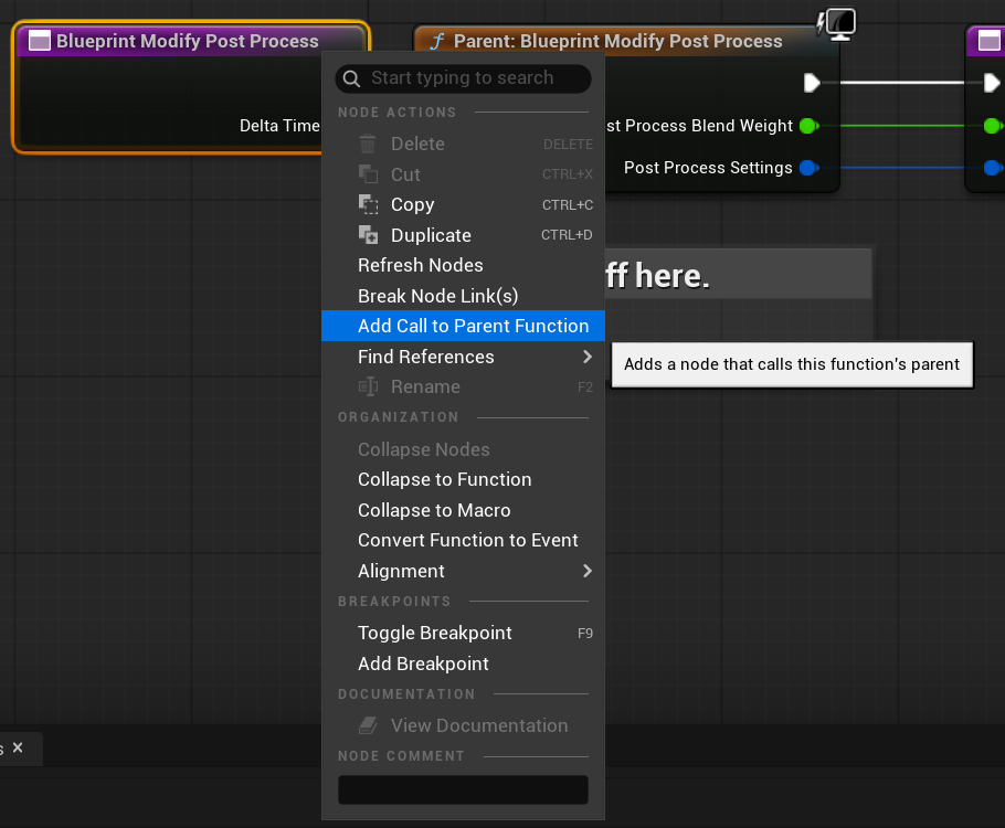 If you’re not sure how to call the parent function, you can right-click (RMB) inside the Blueprint graph and select Add Call to Parent.