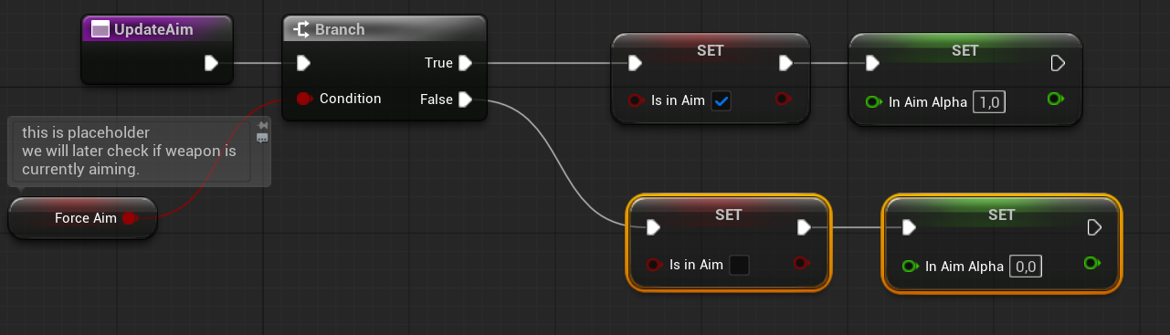 This setup chooses between the Base and Aim locations depending on whether we are in Aim mode or not — simple as that. But now, we need a way to trigger the aim.