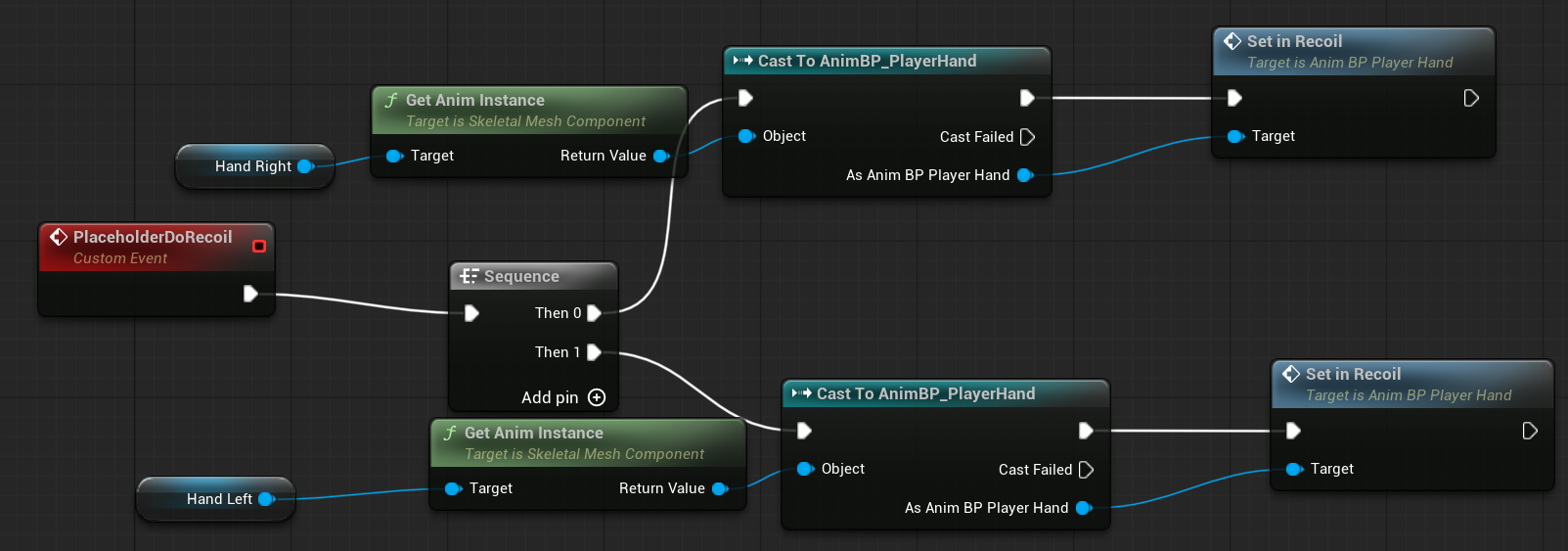Like before, we need to pass the trigger from the Player Controller → Pawn → Anim Blueprint. This will again be a placeholder. Go to your Pawn and add a new event named PlaceholderDoRecoil.