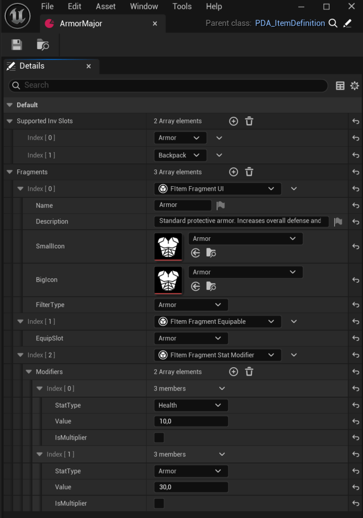 To better understand how the inventory system works, let’s look at some example items. Seeing actual items and how they are defined will make the concepts of ItemDefinition, fragments, and slot behavior much easier to grasp.