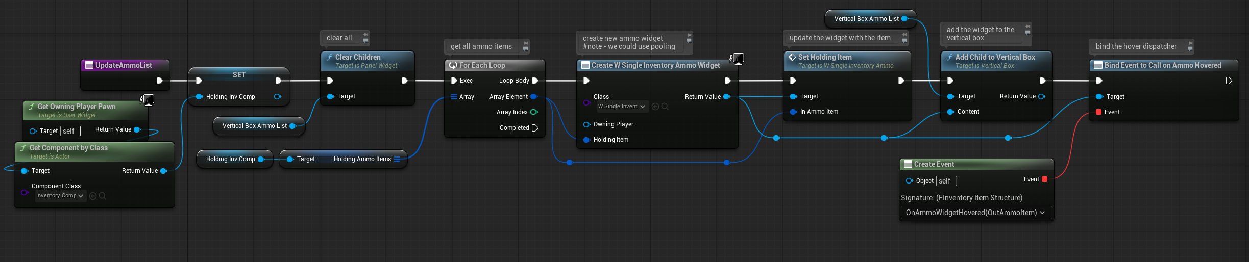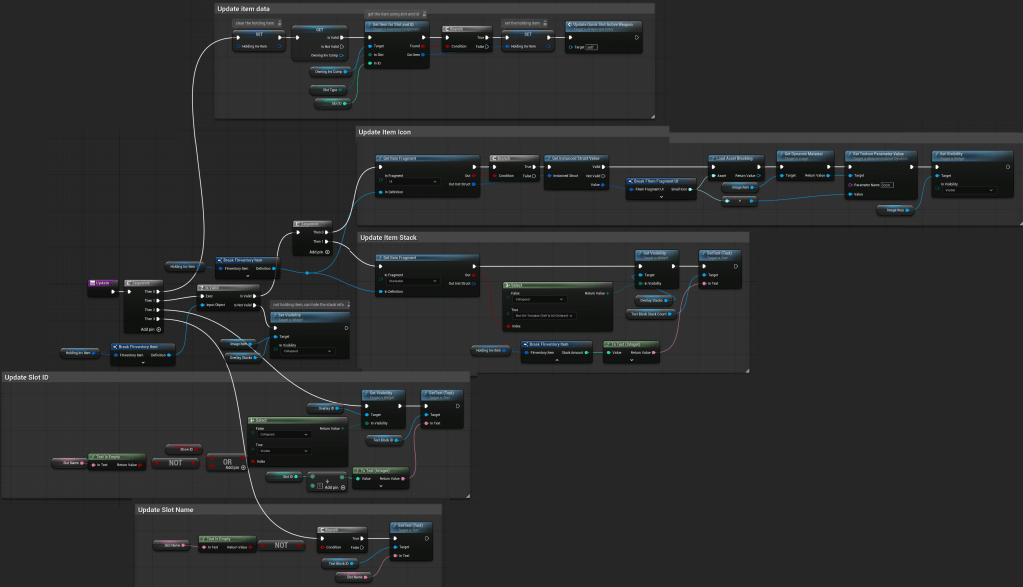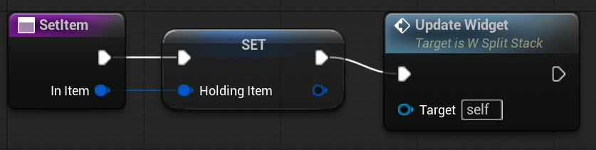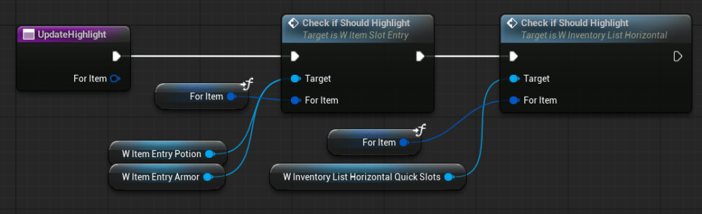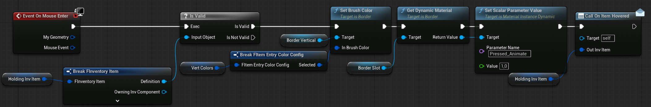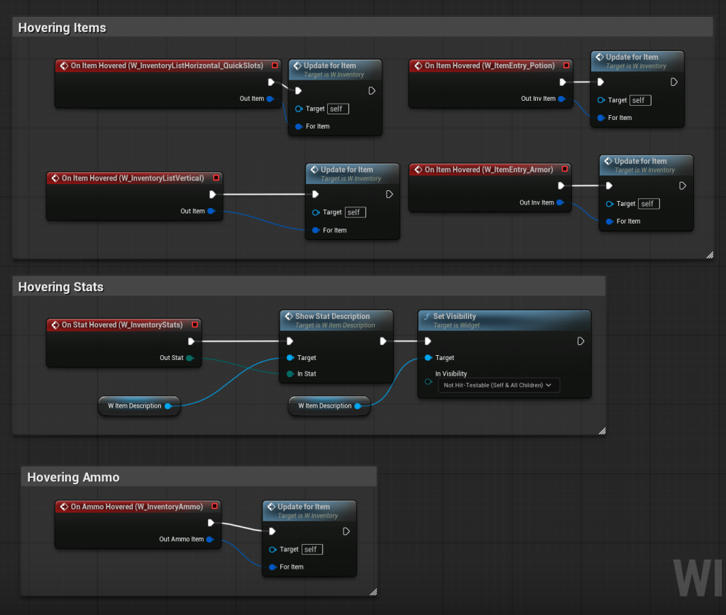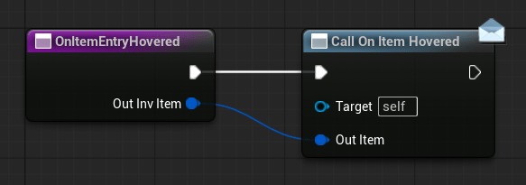 | OnItemHovered | Dispatcher with FInventoryItem output. | Triggered when an item is hovered inside the HorizontalBox. |