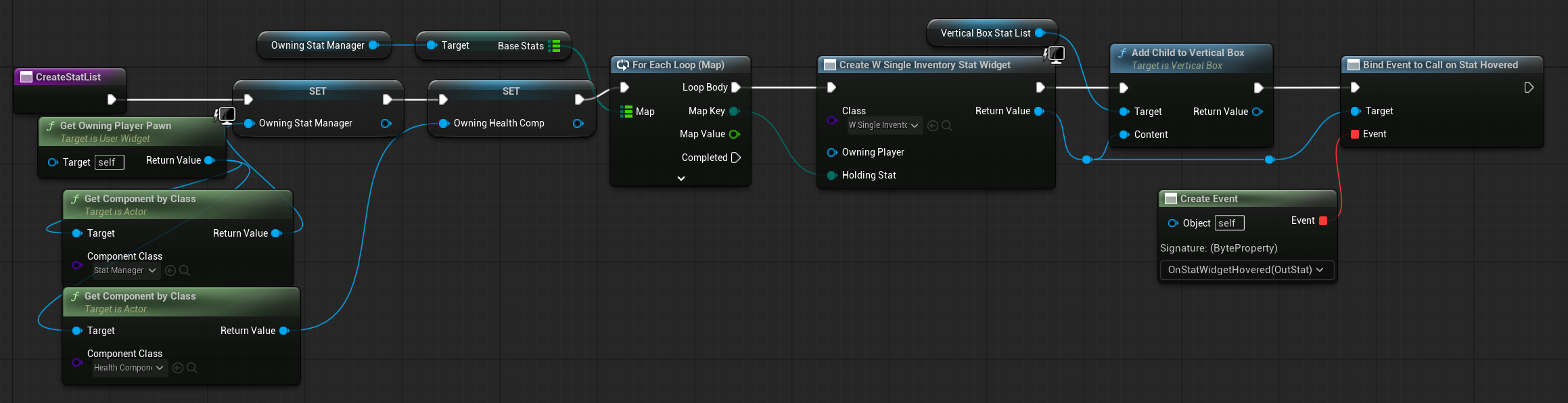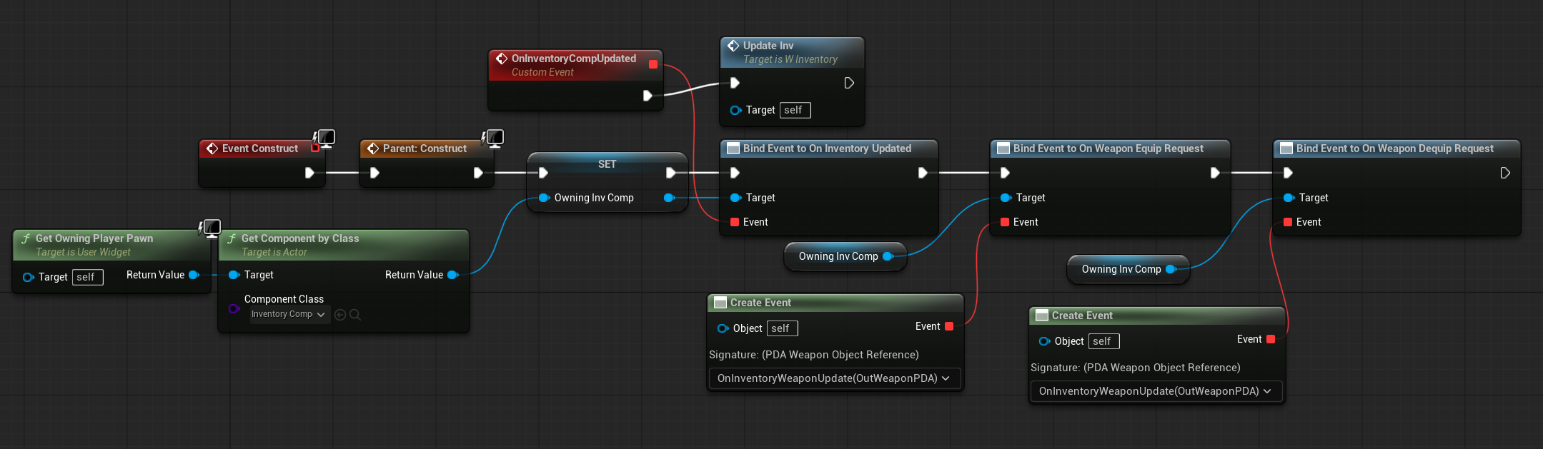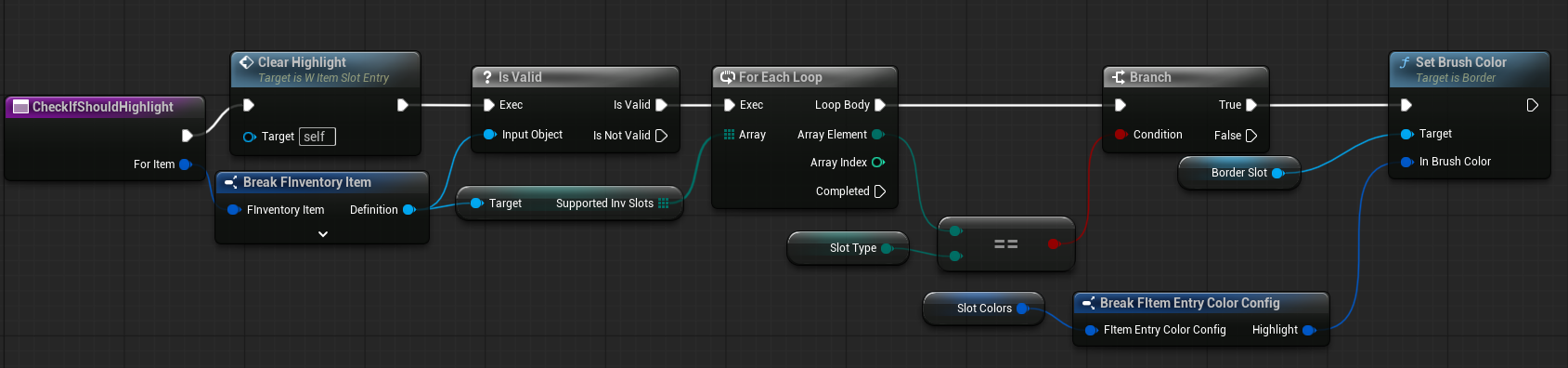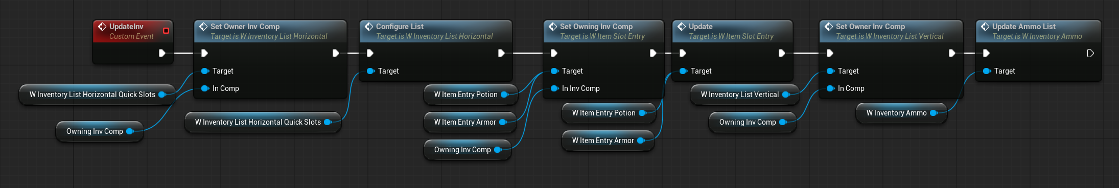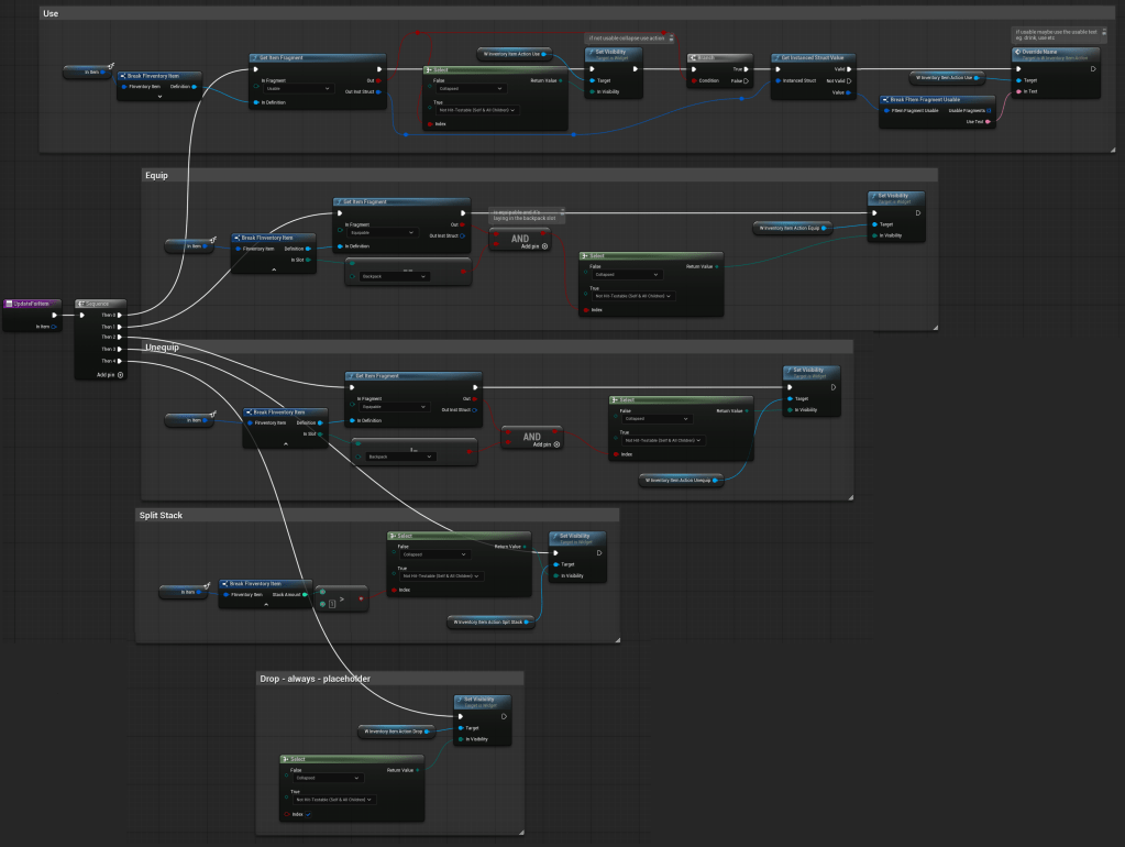 | OnItemHovered | Dispatcher with FInventoryItem output. | Triggered when an item is hovered inside the HorizontalBox. |