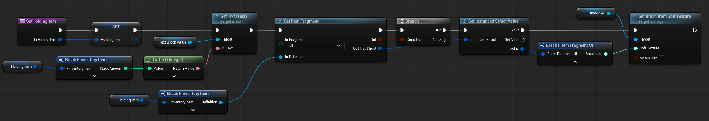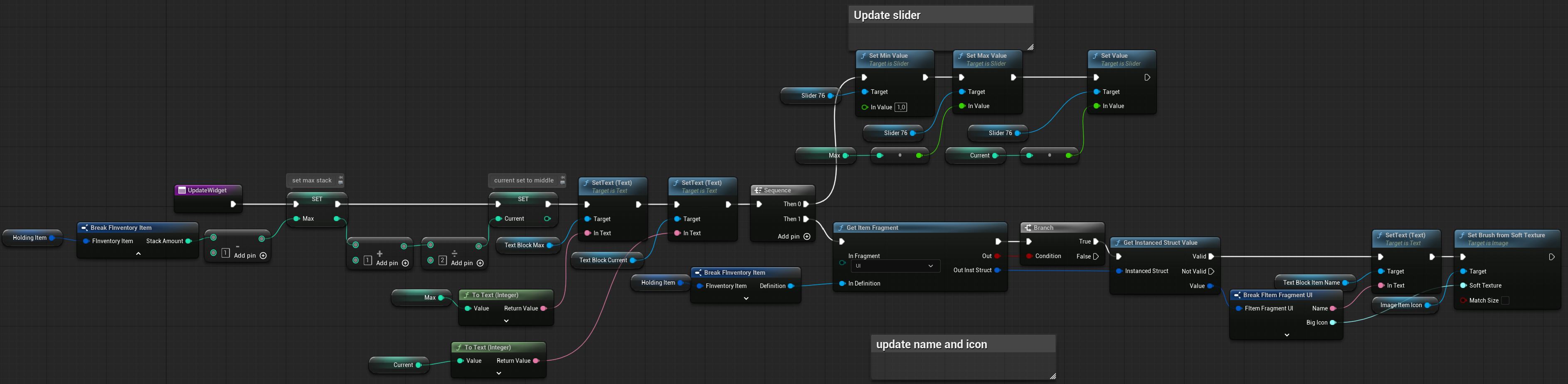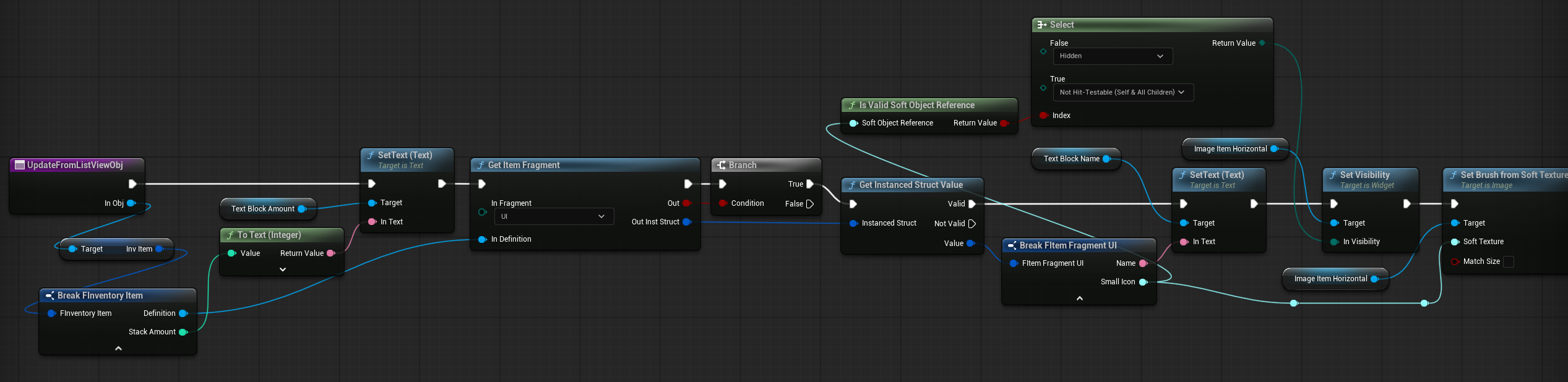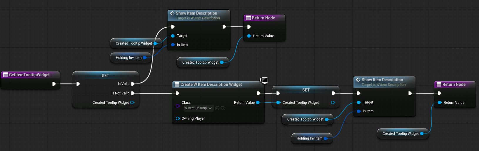 | OnItemHovered | Dispatcher with FInventoryItem output. | Triggered when an item is hovered inside the HorizontalBox. |