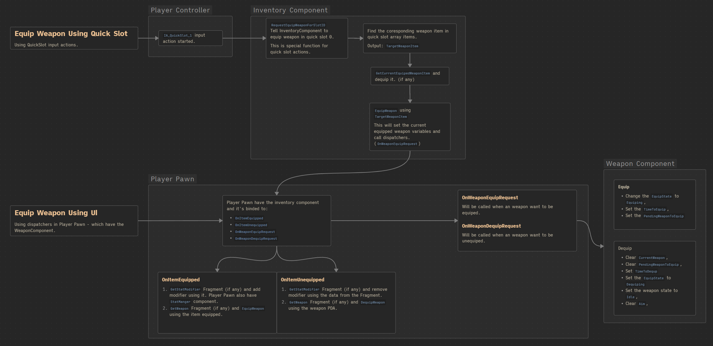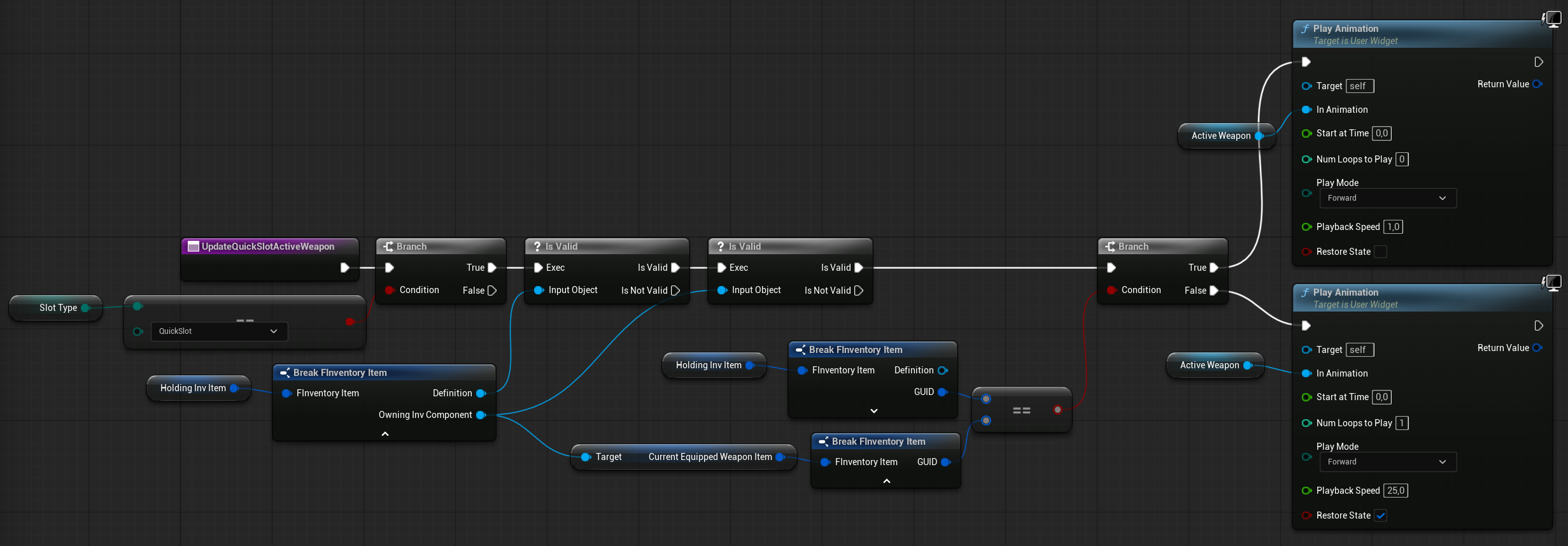 Function called when a weapon is equipped or unequipped. Calls the UpdateQuickSlotActiveWeapon function in the quick-slot horizontal list to update the active weapon display. It’s used to show which weapon is currently equipped by the player.