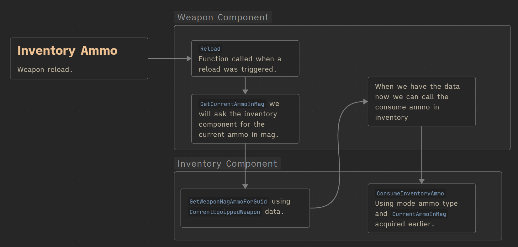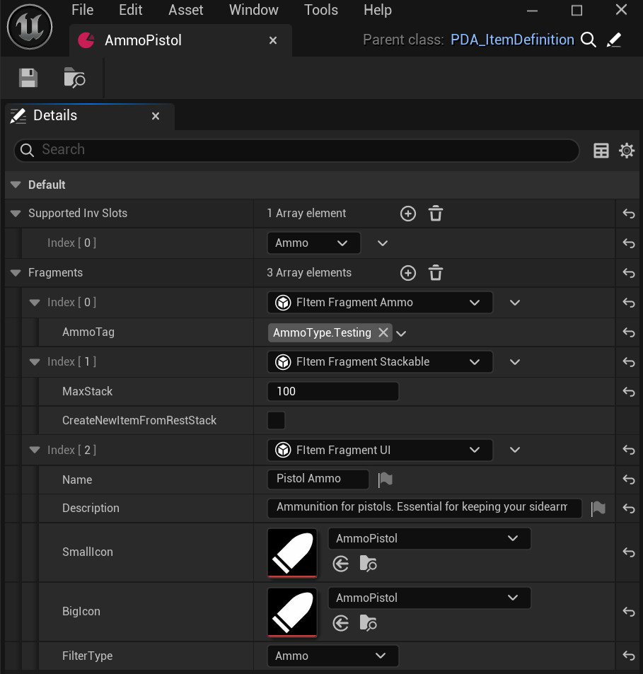 This item uses the Ammo inventory slot, meaning it will be stored in the dedicated ammo array. This allows the system to quickly find specific ammo types without iterating through the entire backpack. - Ammo Fragment: