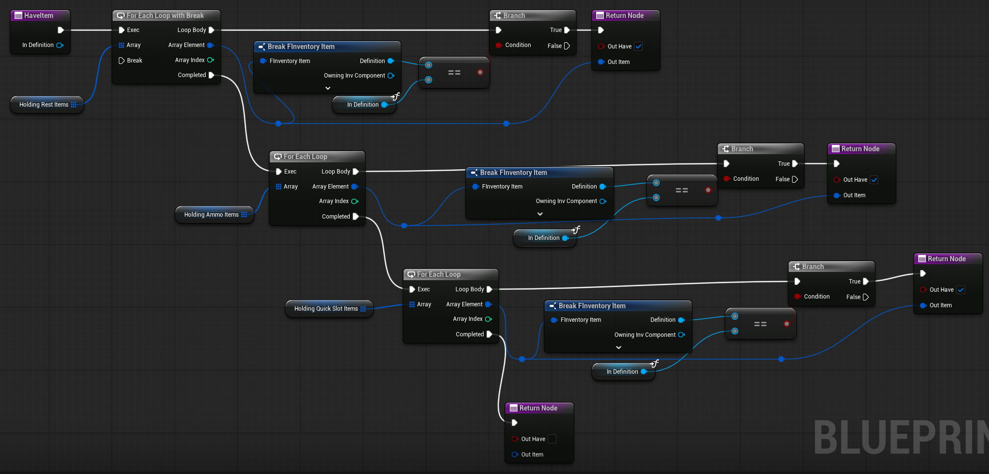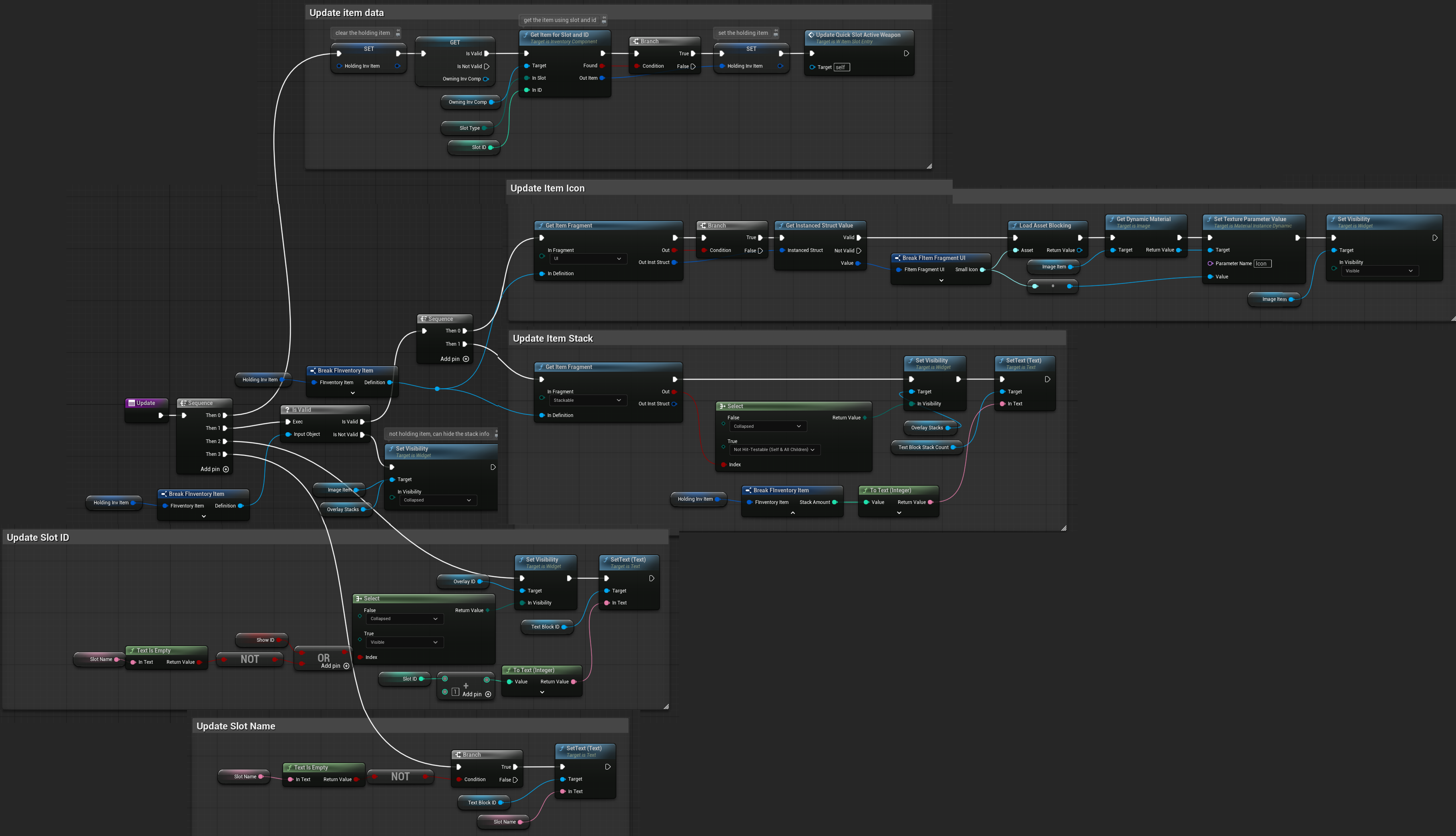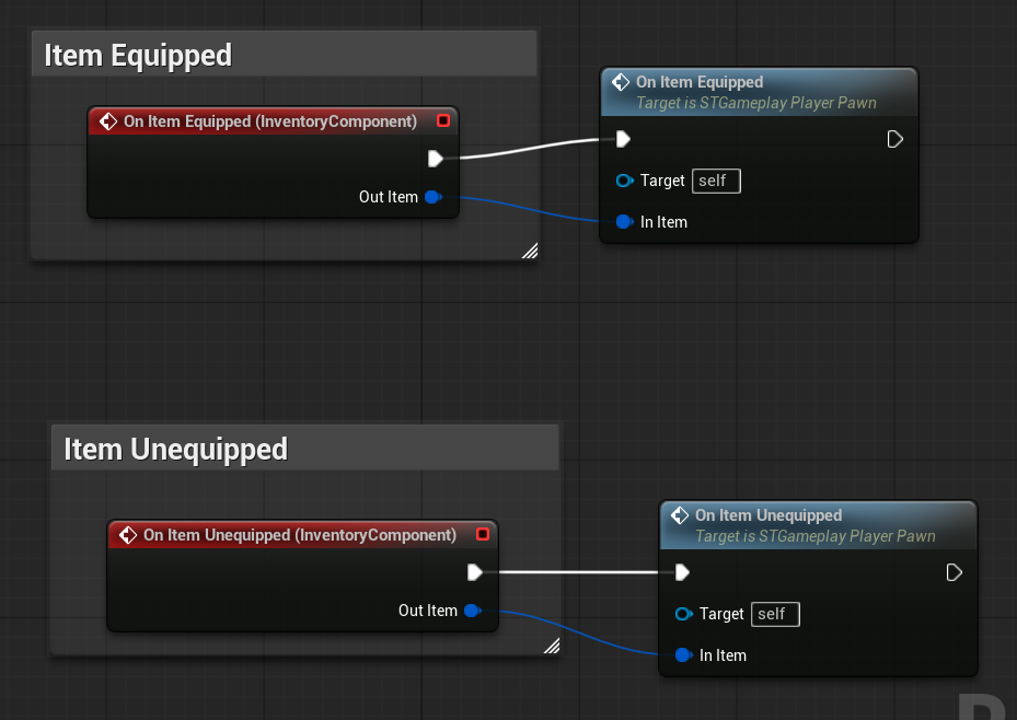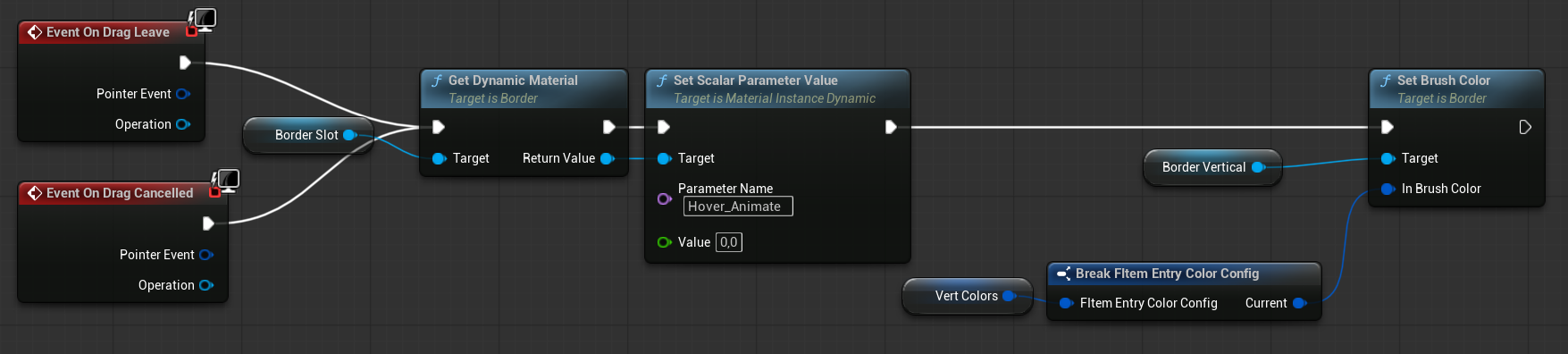 | OnItemHovered | Dispatcher with FInventoryItem output. | Triggered when an item is hovered inside the HorizontalBox. |