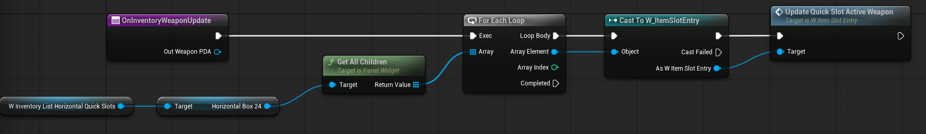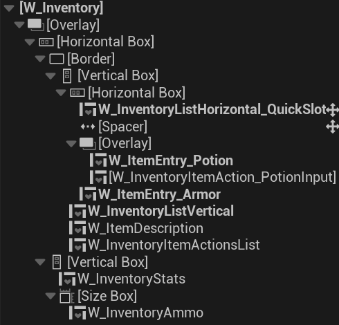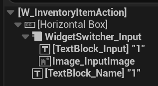 Hierarchy: A simple HorizontalBox containing multiple W_ItemSlotEntry widgets. They will be added in runtime.