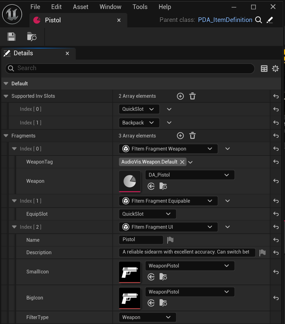 To better understand how the inventory system works, let’s look at some example items. Seeing actual items and how they are defined will make the concepts of ItemDefinition, fragments, and slot behavior much easier to grasp.