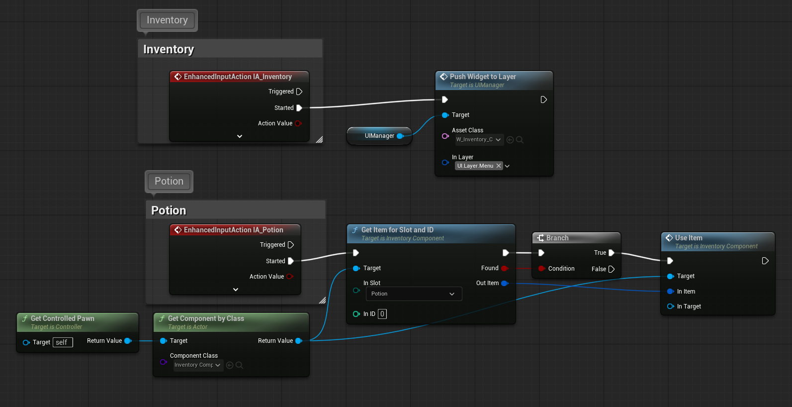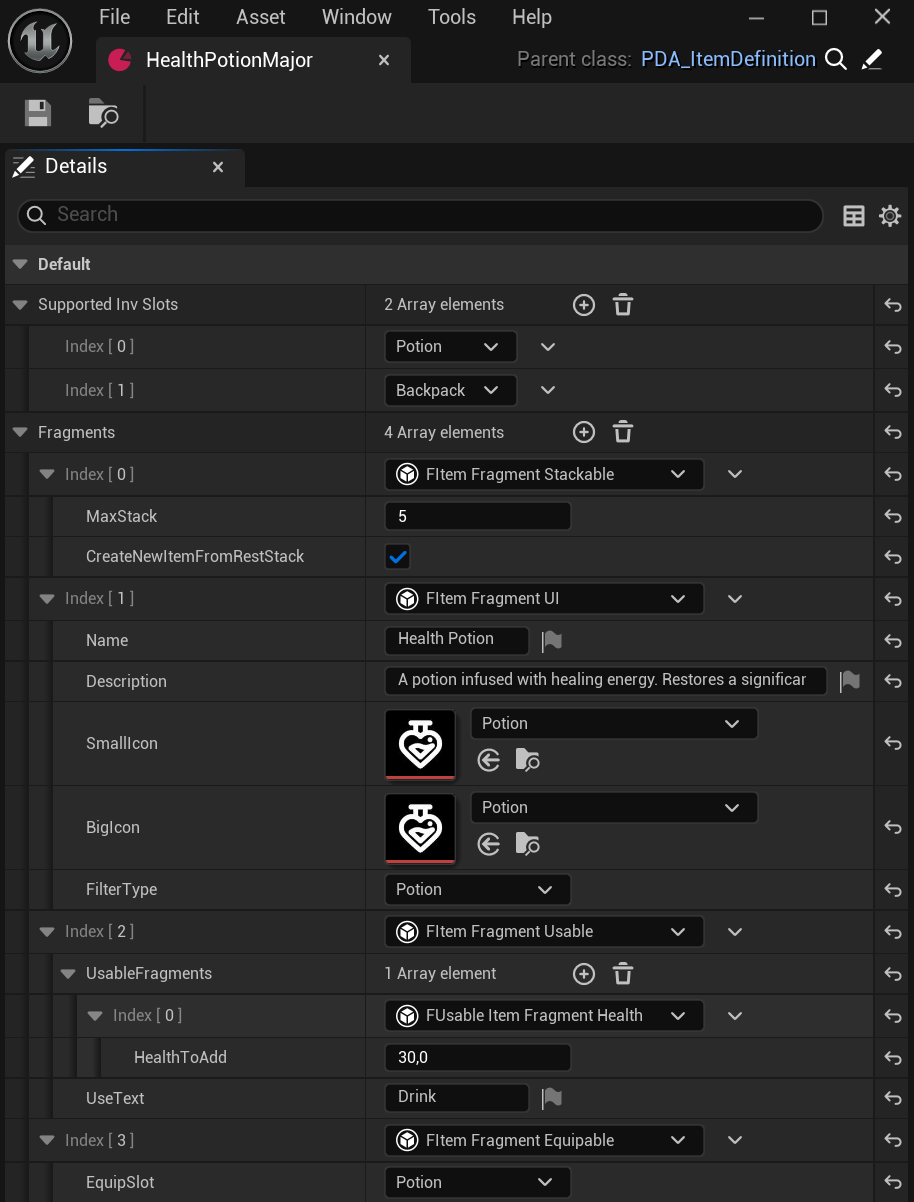ItemDefinitionand composed of modular fragments (Instanced Structs). - Ability to use items — Supports consumables like potions and ammo packs.