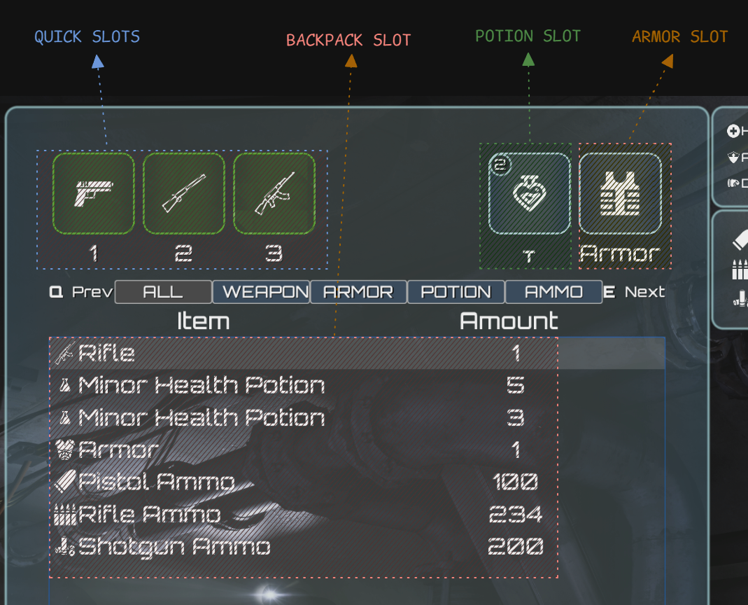 - Multiple types of slots (weapons, armor, backpack, quick slots, etc.)