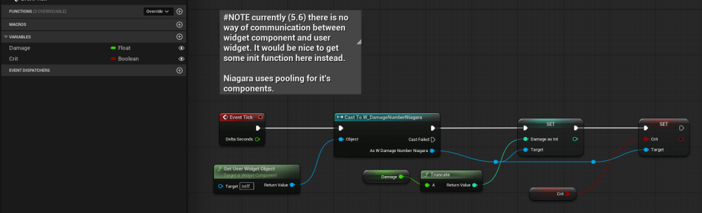 In fact, Tick is required both in the Component and in the User Widget it holds, for the same reason: there’s no reliable spawn-time hook when using Niagara’s pooled components.
