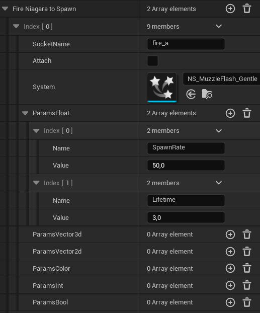 Each struct contains a name and a value, and will be used to automatically pass parameters into Niagara and audio systems at spawn time.