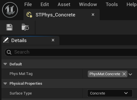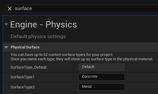 In Project Settings → Engine → Physics, under Physical Surfaces, you can define a list of surface types used in your project. I’ve added: Concrete and Metal.