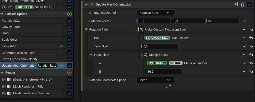 If the particle collides, the rotation rate is set to 0. If not, it remains between 0 and 10, based on the MaterialRandom value—which is chosen between 0 and 1 by default. It’s a simple setup, but visually effective because it creates a clear cause-and-effect dynamic.