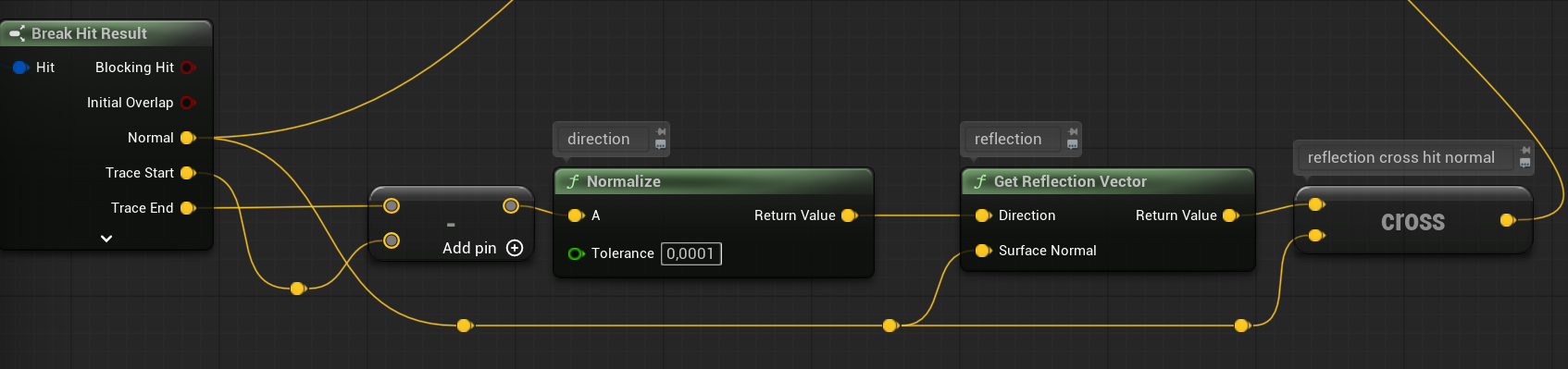The ricochet effect is just a Niagara system that needs to be spawned at the hit location with the correct rotation. The rotation is calculated by mirroring the incoming direction vector using the surface normal at the hit point. In other words, we take the direction vector and reflect it across the hit normal. This gives us the correct ricochet direction, which we can then convert into a spawn rotation for the Niagara effect.