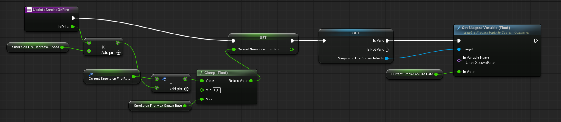 | UpdateSmokeOnFire | Called every frame to cool down the smoke Niagara spawn rate. |