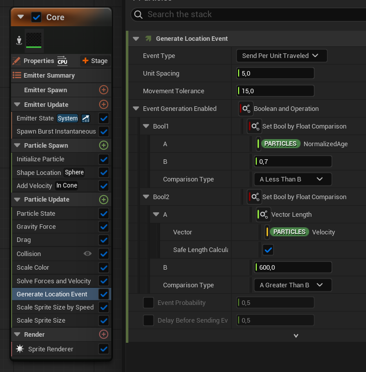 NS_Ricochete. This effect is built using two emitters: Core and Smoke. The Core emitter generates a location event when its particles have high velocity and are not close to dying.