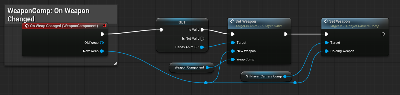 When the weapon is changed, the Pawn updates both the Animation Blueprint and the Camera with the new weapon settings.