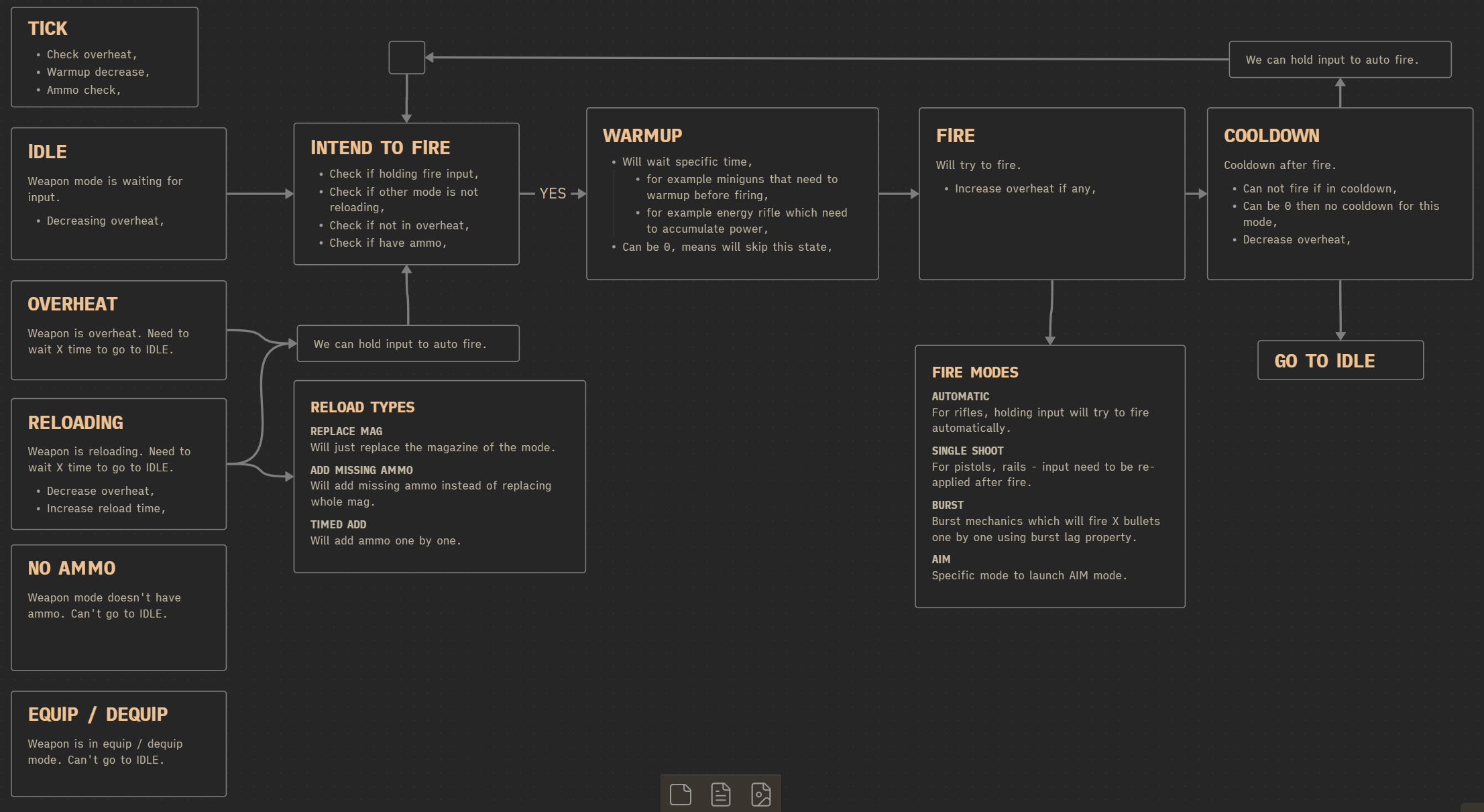 This structure allows us to support a wide variety of weapon types, from simple pistols to complex miniguns, while keeping the logic manageable and consistent.